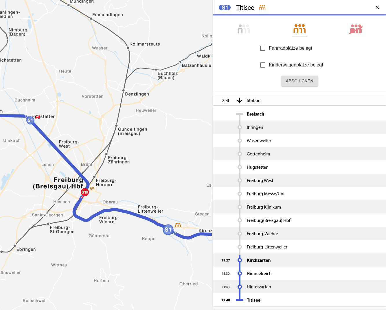 Unser konkretes Ziel war es dabei, einen Prototypen für eine Live-Karte für die Ost-West-Achse der Breisgau-S-Bahn 2020 zu entwickeln. Ausgangspunkt dieser Überlegung waren die teils nicht unerheblichen Verspätungen und Zug-Ausfälle in diesem Netz, welche einer mangelhaften Kunden-Information gegenüber stehen. Aus einer ganz ähnlichen Ausgangssituation heraus haben wir mit der Entwicklung der Livemap der S-Bahn München bereits bewiesen, wie eine unmittelbare und leicht zu überblickende Bereitstellung von Echtzeitdaten an die Fahrgäste dabei helfen kann, solch eine kritische Verkehrssituation zu entspannen. Denn wenn man bereits beim Verlassen des Hauses weiß, dass ein Zug, den man nehmen wollte, ausfällt, hat man eventuell noch die Chance, auf das Fahrrad oder eine Mitfahrgelegenheit auszuweichen, anstatt ewig am Bahnhof herumzustehen, nur um sich dann in die nächste überfüllte Bahn zu quetschen. Im Gegenzug könnte es durch mehr Transparenz auch gelingen, bereits für den ÖPNV verloren geglaubte Kunden wieder zurück auf die Schiene zu bringen. Denn wenn man auf der Live-Karte sieht, dass bald eine Bahn einfährt, hat man auch eine gewisse Sicherheit, rechtzeitig ans Ziel zu kommen.